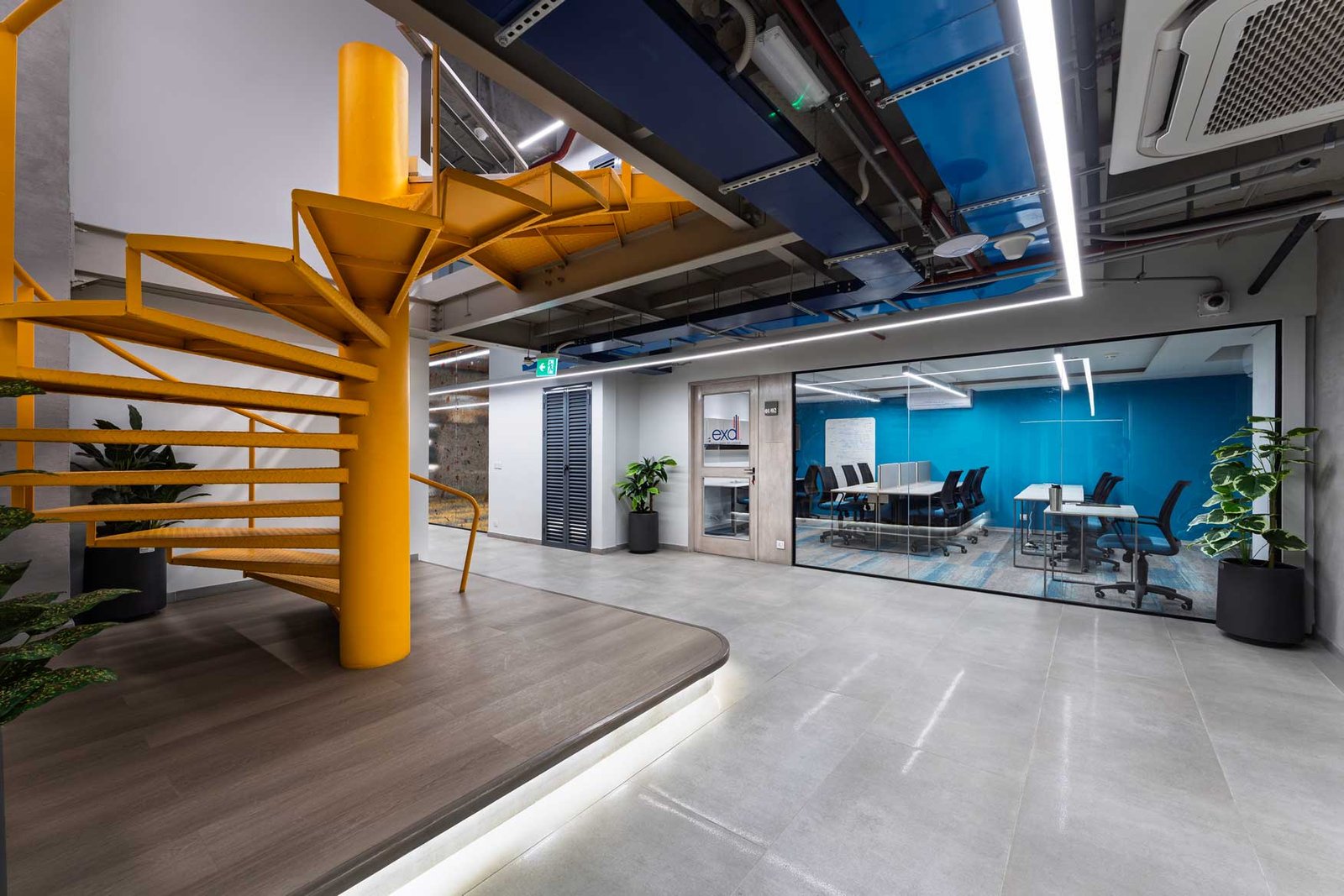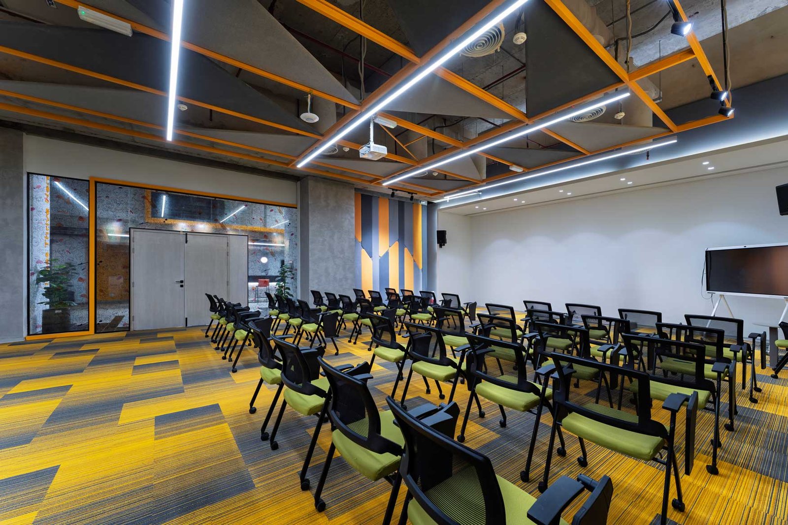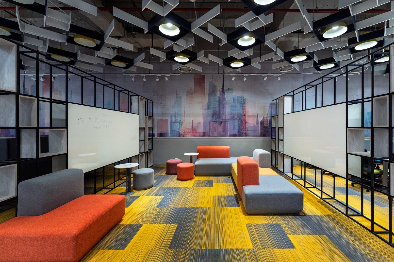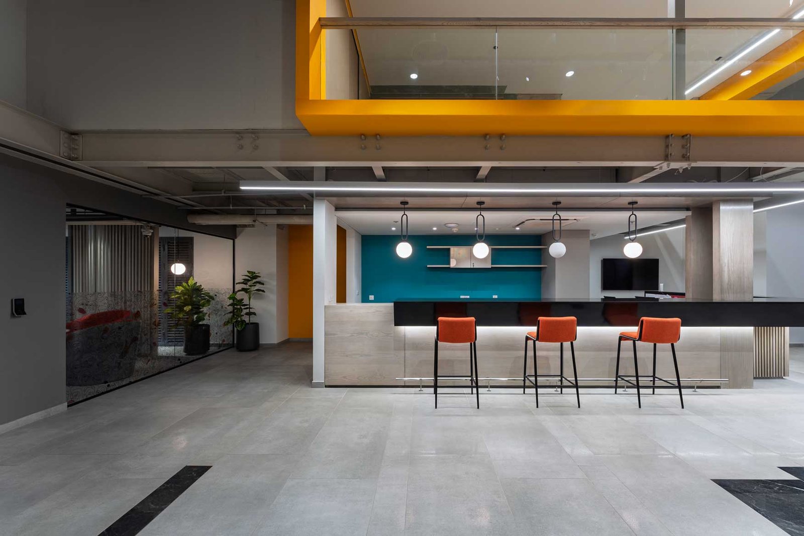 We recently renovated a vibrant, functional hub that promotes creativity and collaboration. The design features a striking mix of bold colors, clean lines, and playful lighting elements. A suspended shipping container meeting pod adds a bold industrial flair, while the open-plan café-style layout encourages informal discussions and relaxed breaks. Carefully chosen materials and a dynamic ceiling-light installation bring energy and identity to the space, making it both inviting and productive.